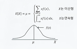 - 기대값(평균): 확률변수의 평균적인 값입니다. 이산 확률변수와 연속 확률변수 모두에 대해 계산할 수 있습니다.