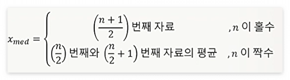 - 중위수, 중앙값(Median)은 데이터를 크기 순으로 나열했을 때 중앙에 위치하는 값입니다. 이상치의 영향을 덜 받아서 때때로 평균보다 선호되기도 해요.