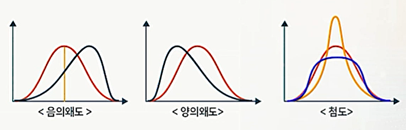 - 왜도는 데이터 분포의 비대칭성을 측정하며, 양의 왜도는 오른쪽으로 긴 꼬리를, 음의 왜도는 왼쪽으로 긴 꼬리를 가진 분포를 의미합니다.